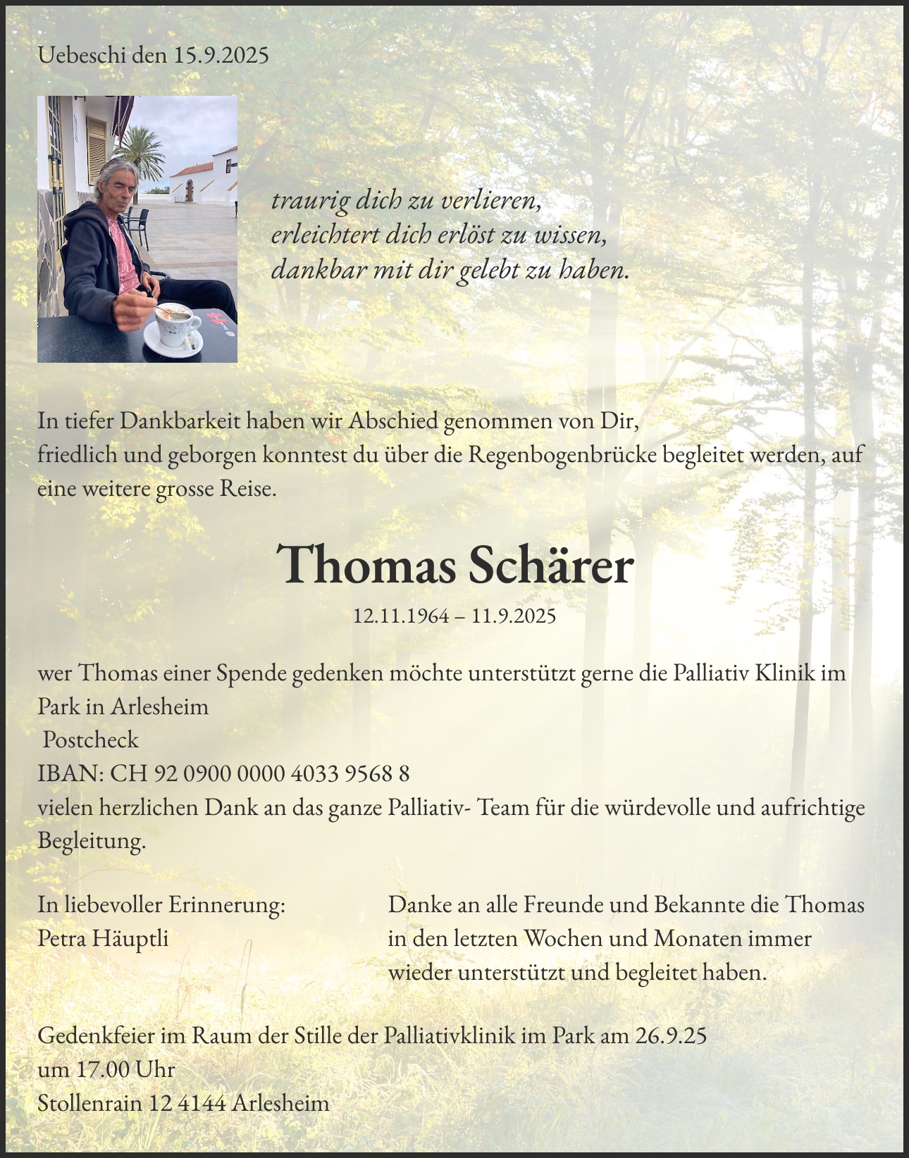 wer Thomas einer Spende gedenken möchte unterstützt gerne die Palliativ Klinik im Park in Arlesheim Postcheck IBAN: CH 92 0900 0000 4033 9568 8 vielen herzlichen Dank an das ganze Palliativ- Team für die würdevolle und aufrichtige Begleitung.