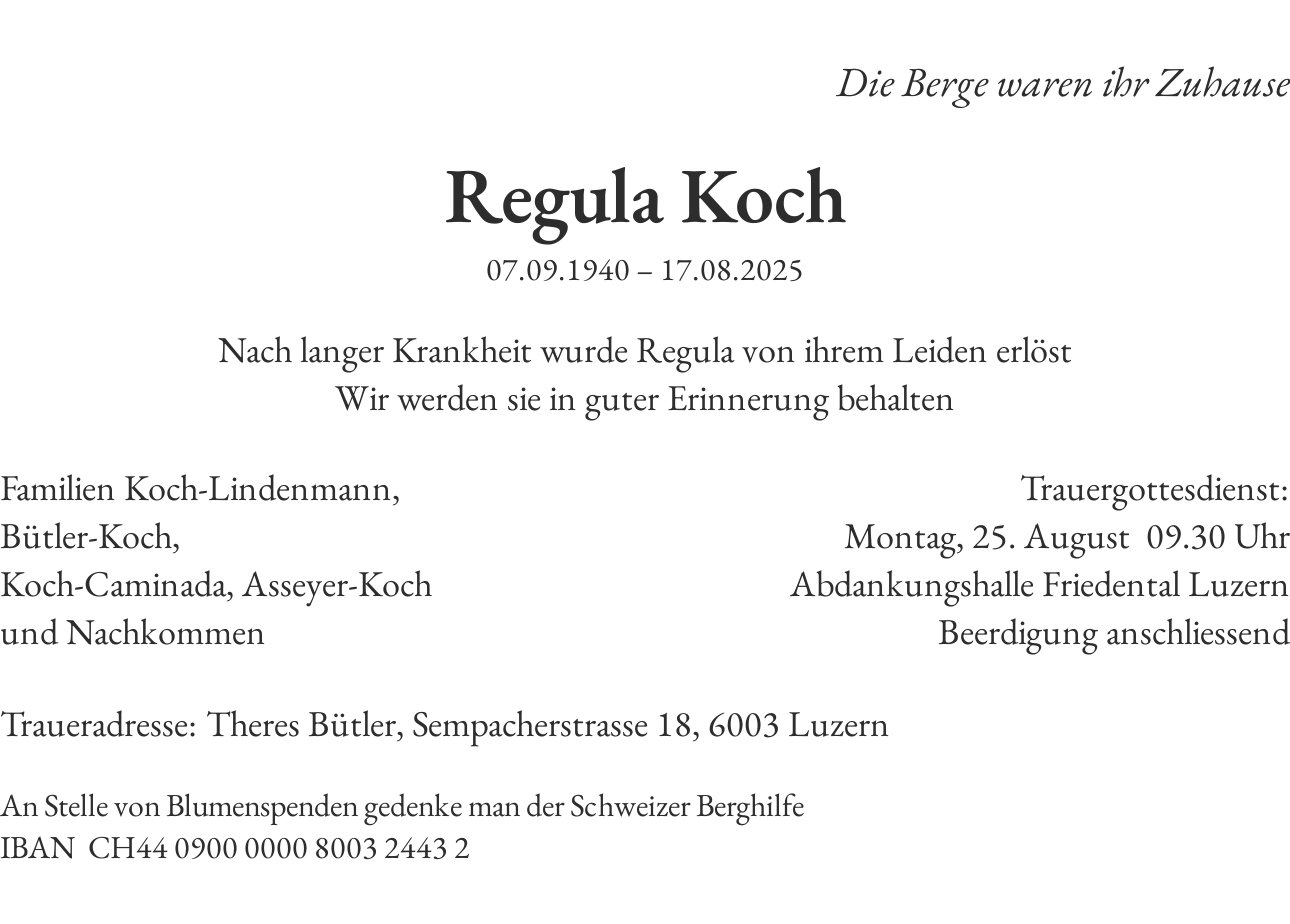 An Stelle von Blumenspenden gedenke man der Schweizer Berghilfe IBAN CH44 0900 0000 8003 2443 2
