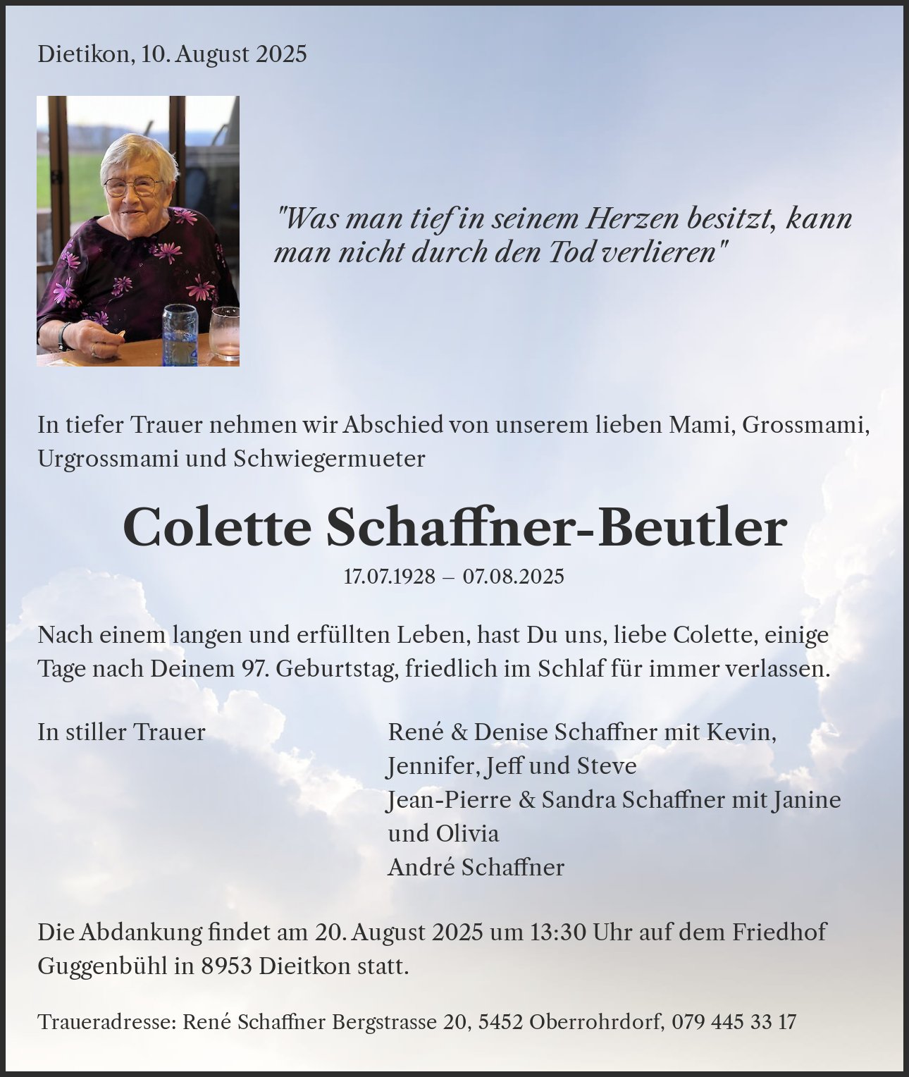 Nach einem langen und erfüllten Leben, hast Du uns, liebe Colette, einige Tage nach Deinem 97. Geburtstag, friedlich im Schlaf für immer verlassen.
