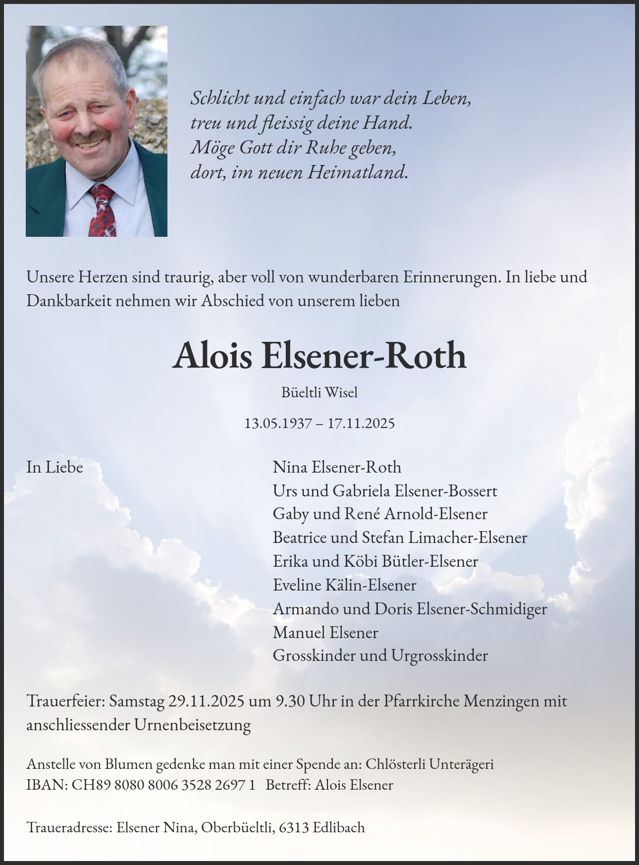 Anstelle von Blumen gedenke man mit einer Spende an: Chlösterli Unterägeri IBAN: CH89 8080 8006 3528 2697 1 Betreff: Alois Elsener Traueradresse: Elsener Nina, Oberbüeltli, 6313 Edlibach