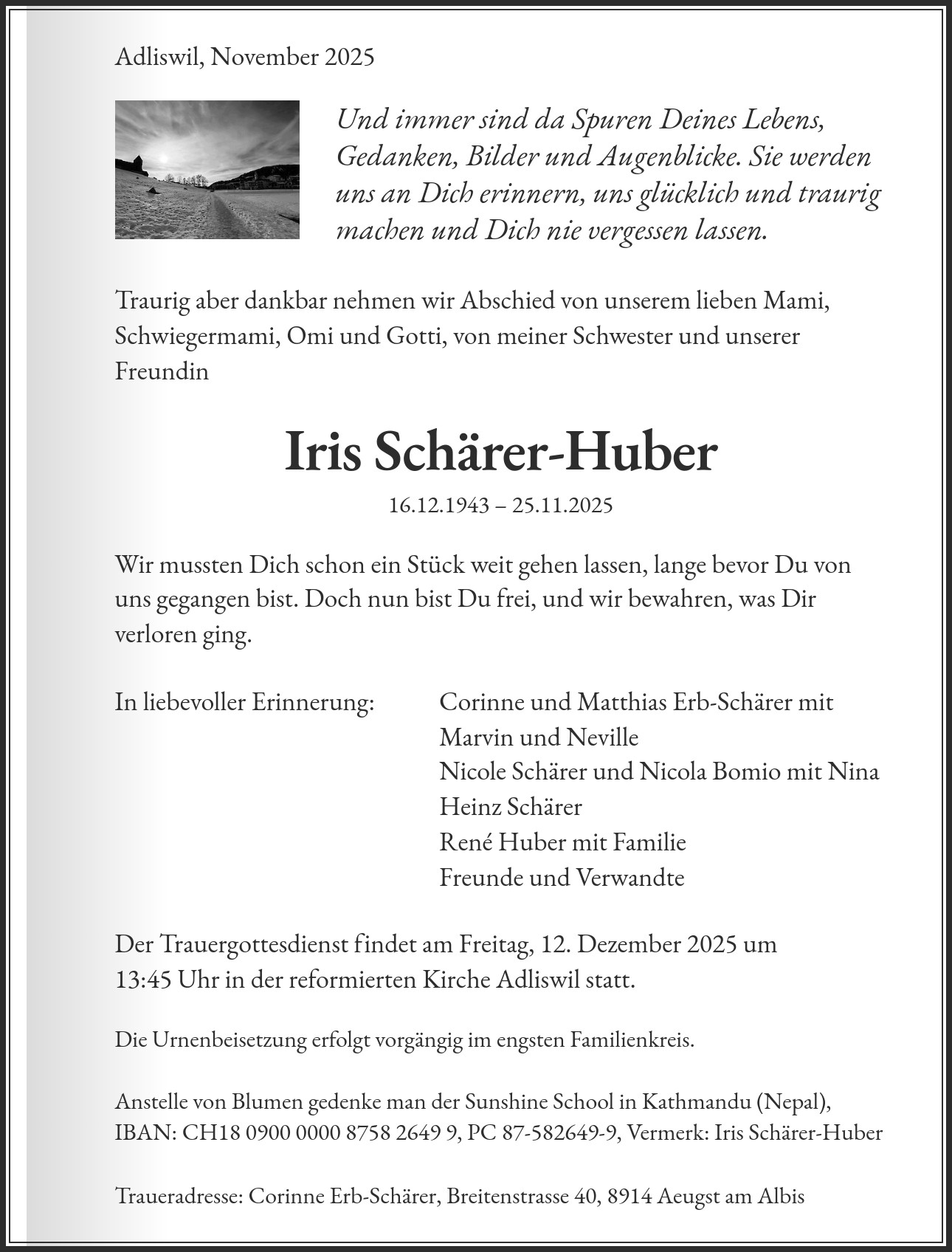 Die Urnenbeisetzung erfolgt vorgängig im engsten Familienkreis. Anstelle von Blumen gedenke man der Sunshine School in Kathmandu (Nepal), IBAN: CH18 0900 0000 8758 2649 9, PC 87-582649-9, Vermerk: Iris Schärer-Huber Traueradresse: Corinne Erb-Schärer, Breitenstrasse 40, 8914 Aeugst am Albis