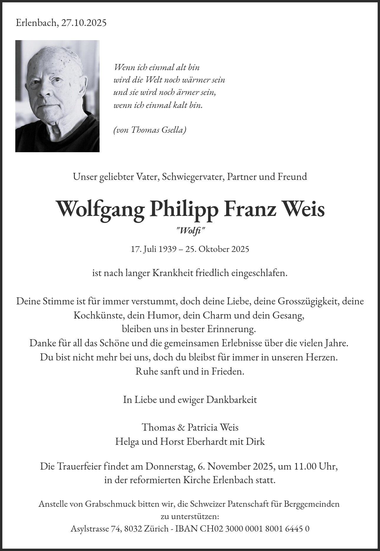 Die Trauerfeier findet am Donnerstag, 6. November 2025, um 11.00 Uhr, in der reformierten Kirche Erlenbach statt.