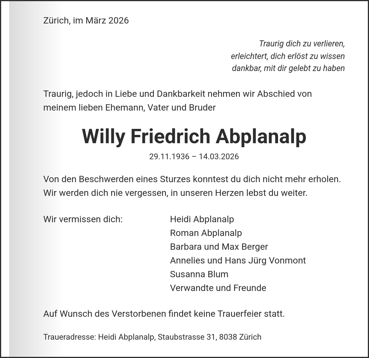 Traueradresse: Heidi Abplanalp, Staubstrasse 31, 8038 Zürich